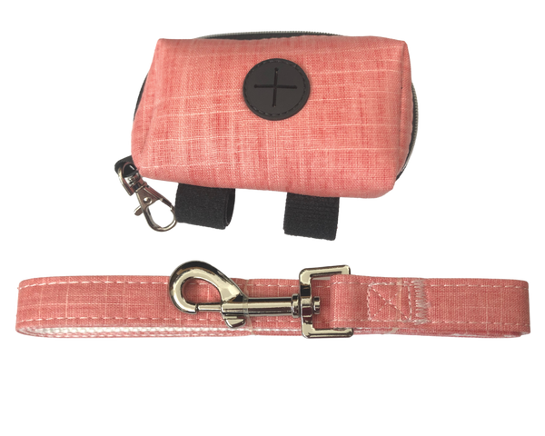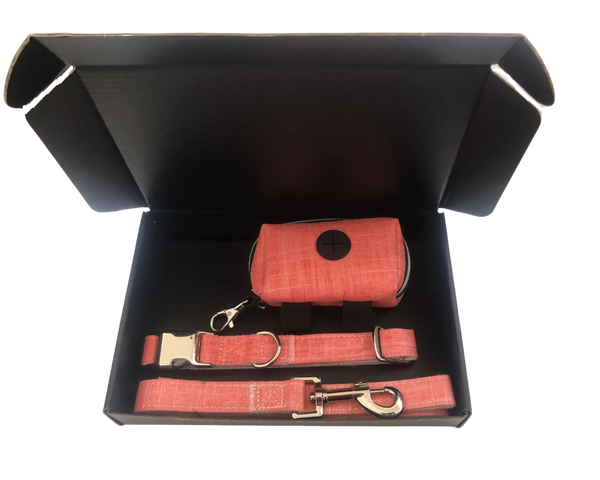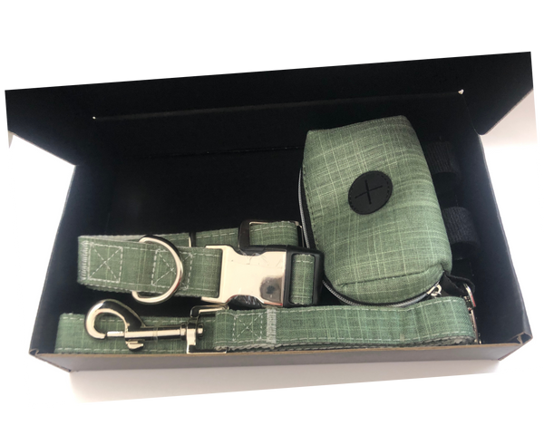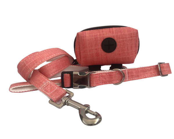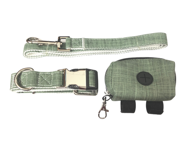 These sets include a collar with quick release clip, leash and poop bag dispenser which can be attached to the leash so that it doesn't dangle.