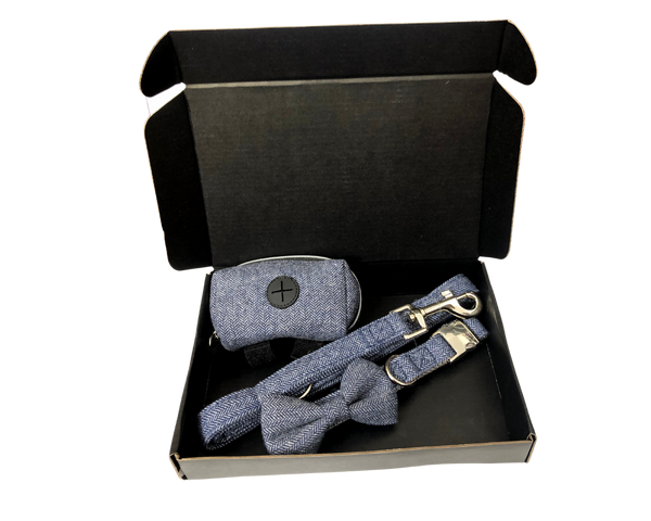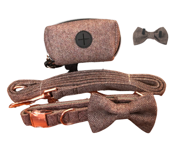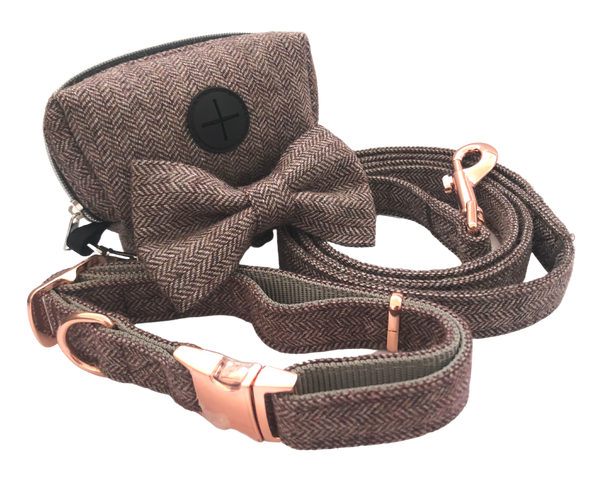 These sets include a collar with a removable bow, leash and poop bag dispenser.